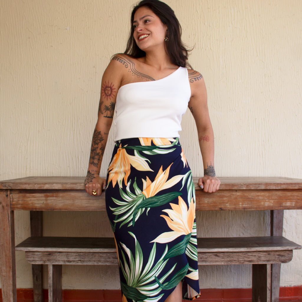 Cropped Moana produzido em ribana lisa, decote um ombro só, dupla camada - zero transparência.