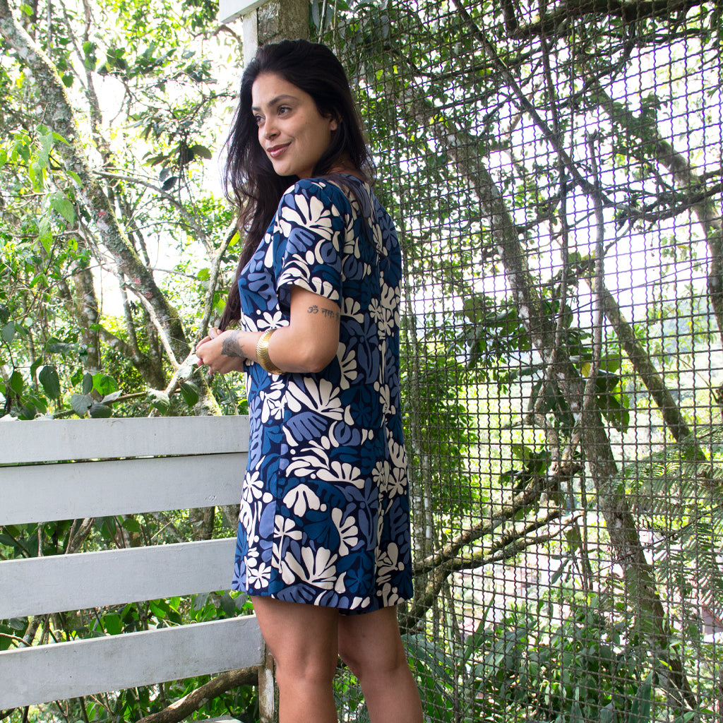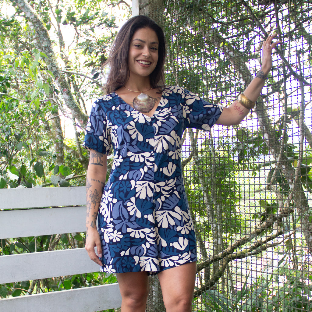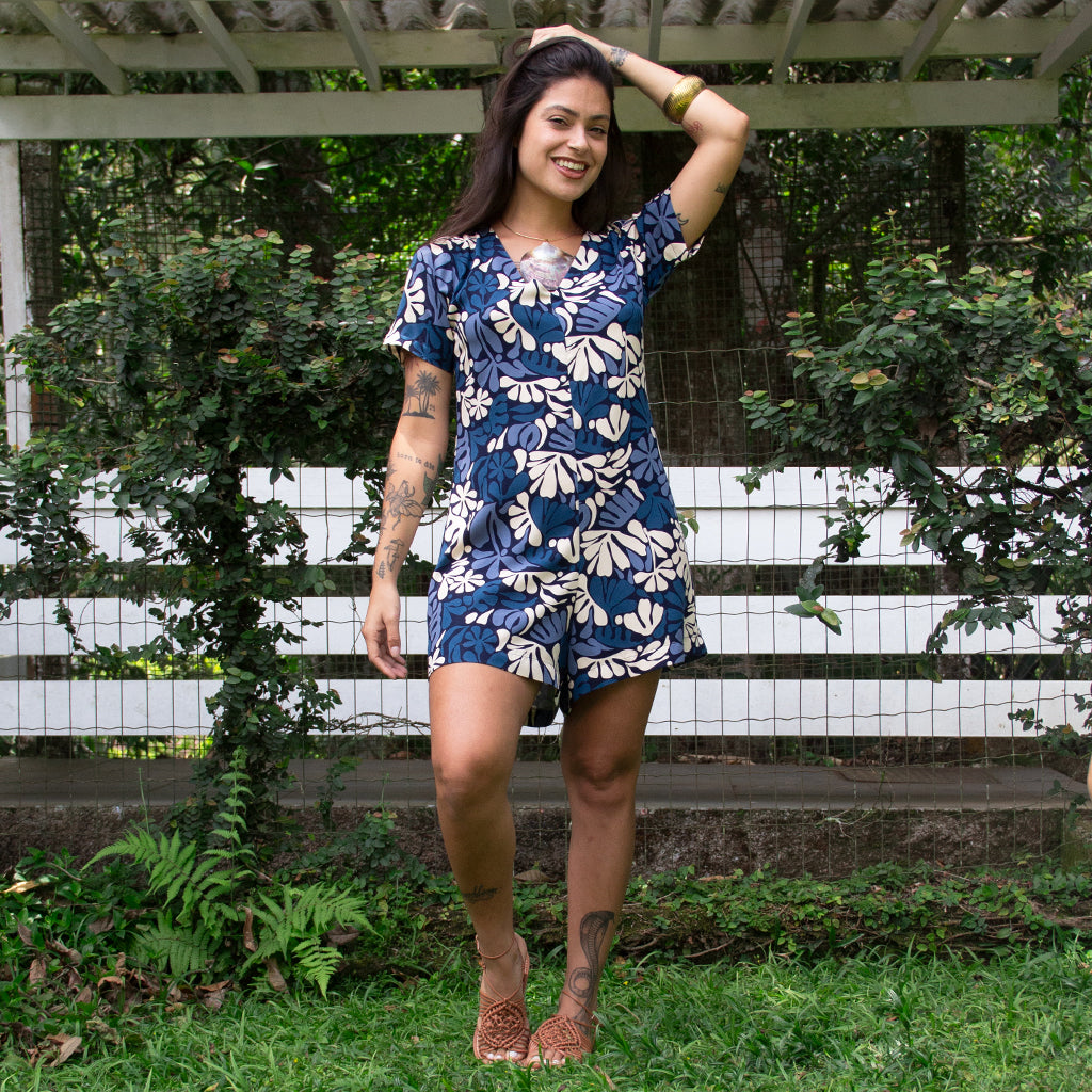 Macaquinho Zoe produzido em viscolinho estampado em decote V.