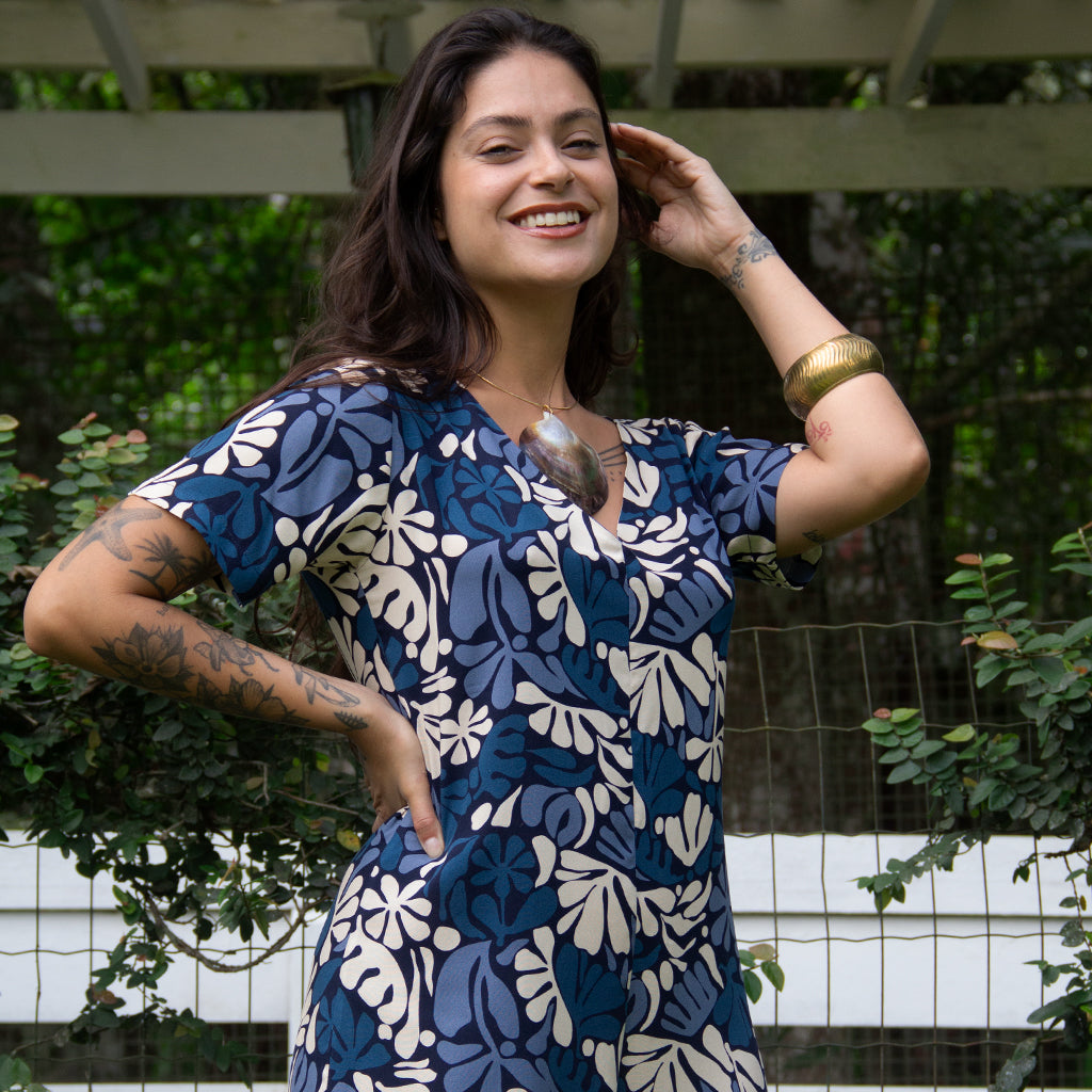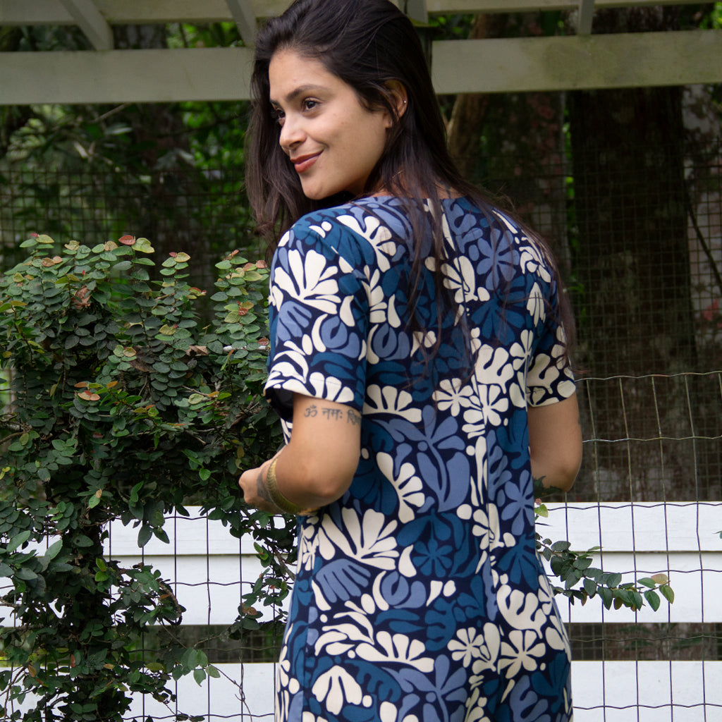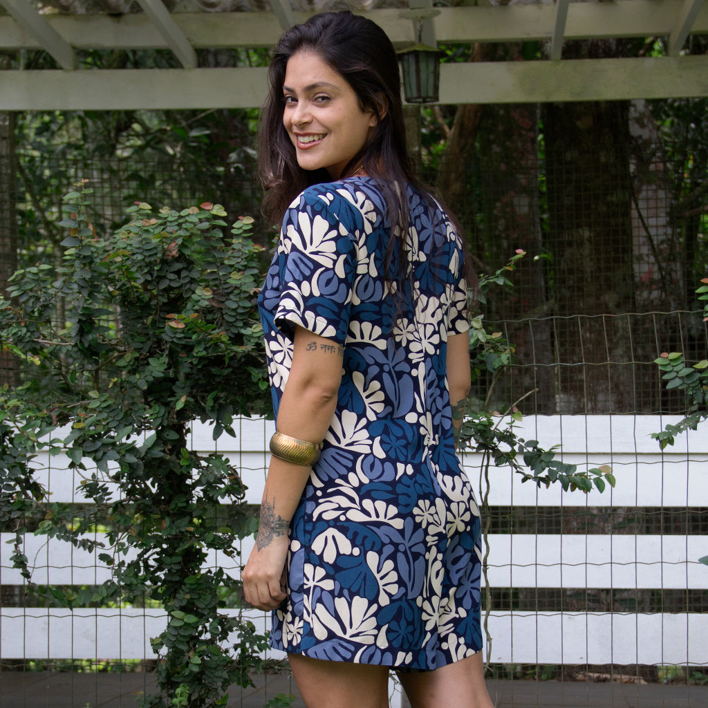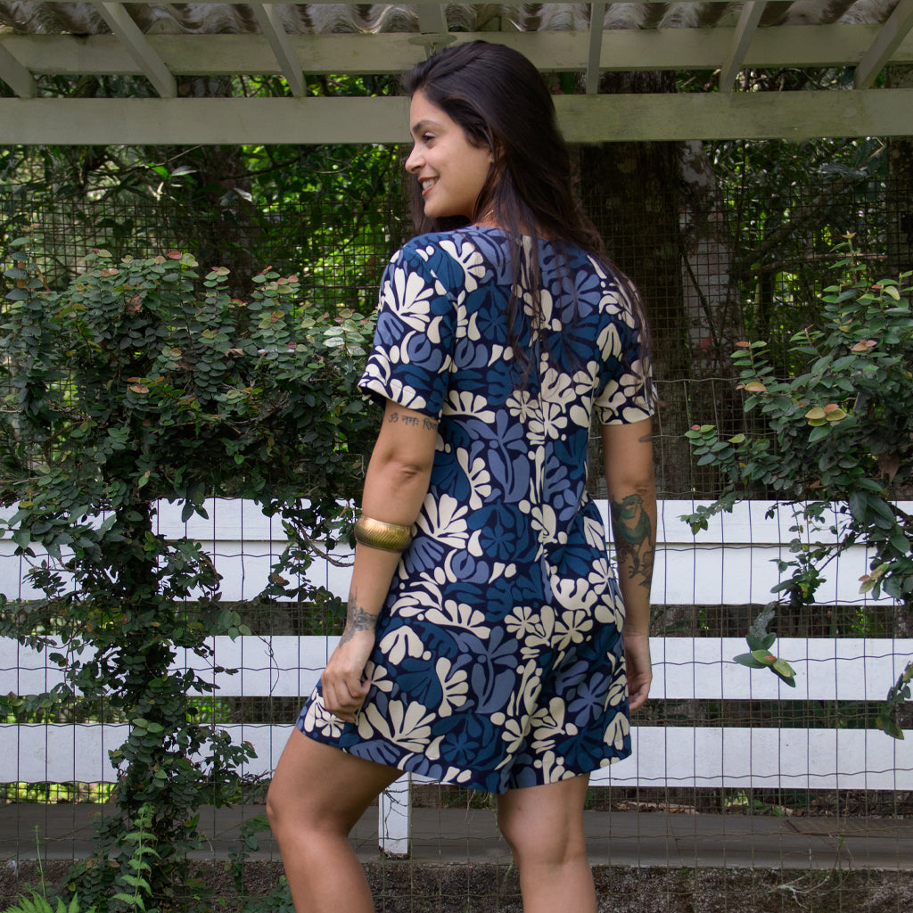 Macaquinho Zoe produzido em viscolinho estampado em decote V.