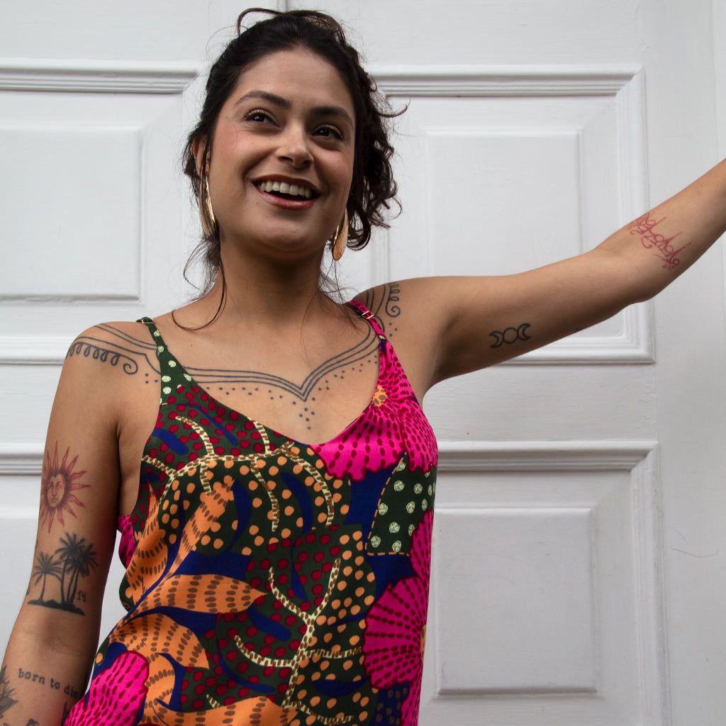 Vestido longo produzido em viscolinho estampado, com fendas laterais e delicado decote nas costas que acrescenta um toque sutil de charme e sofisticação.
