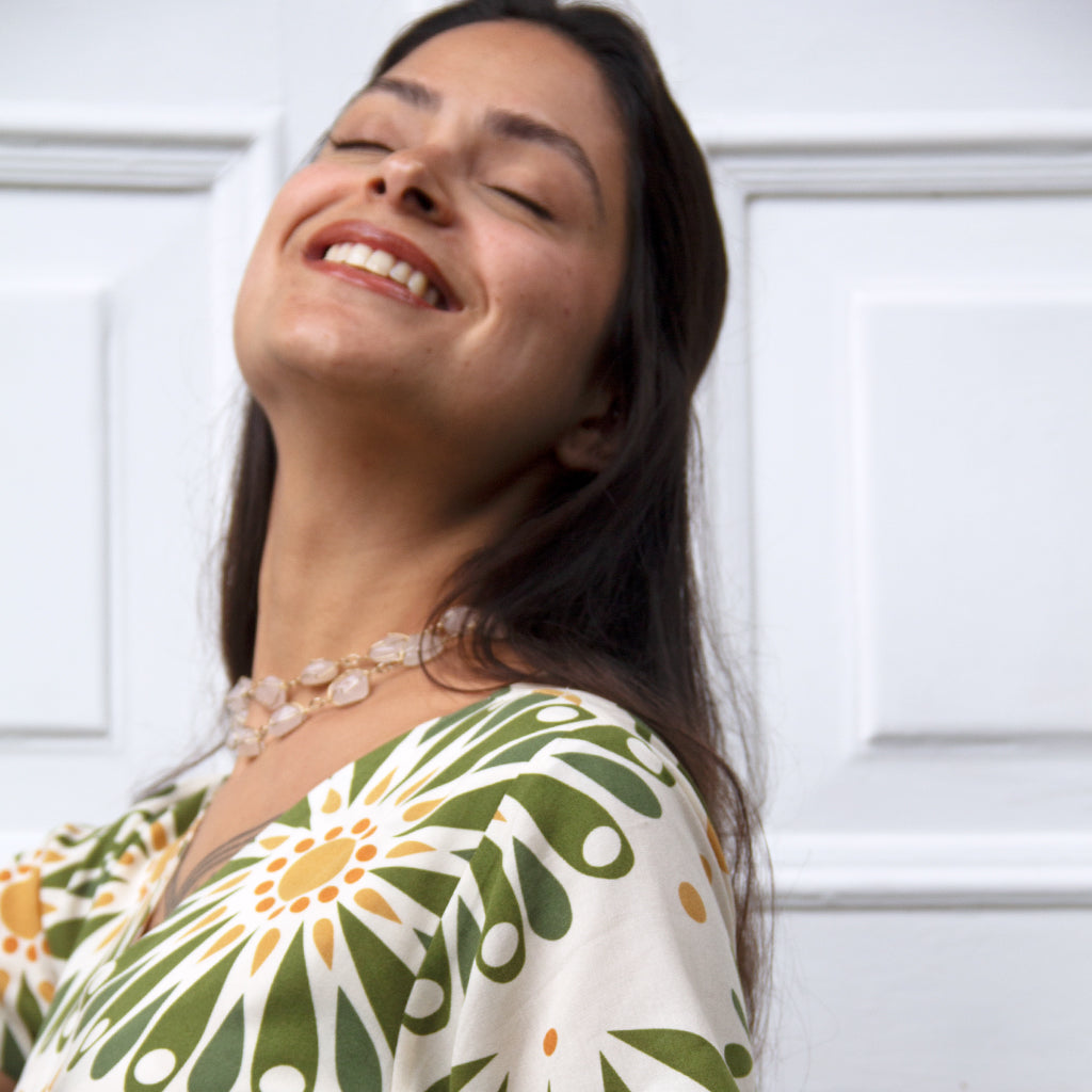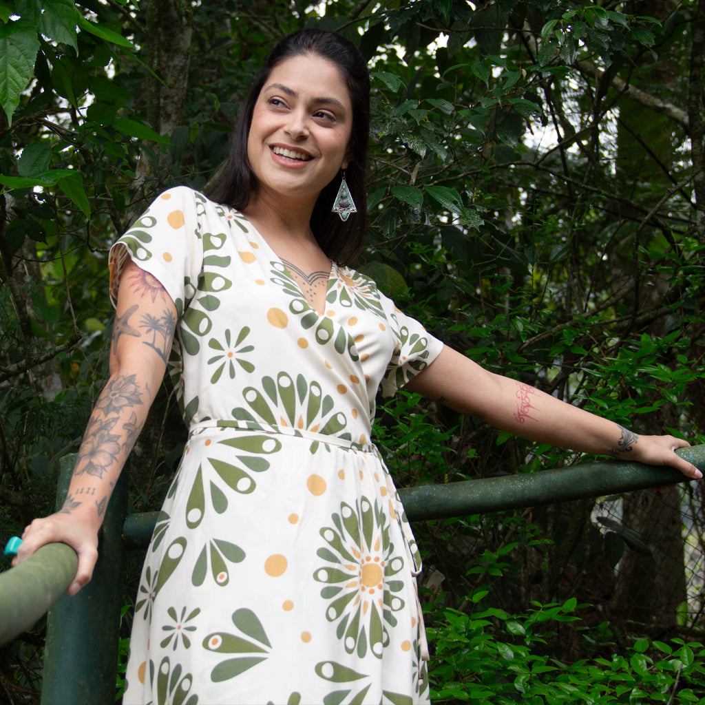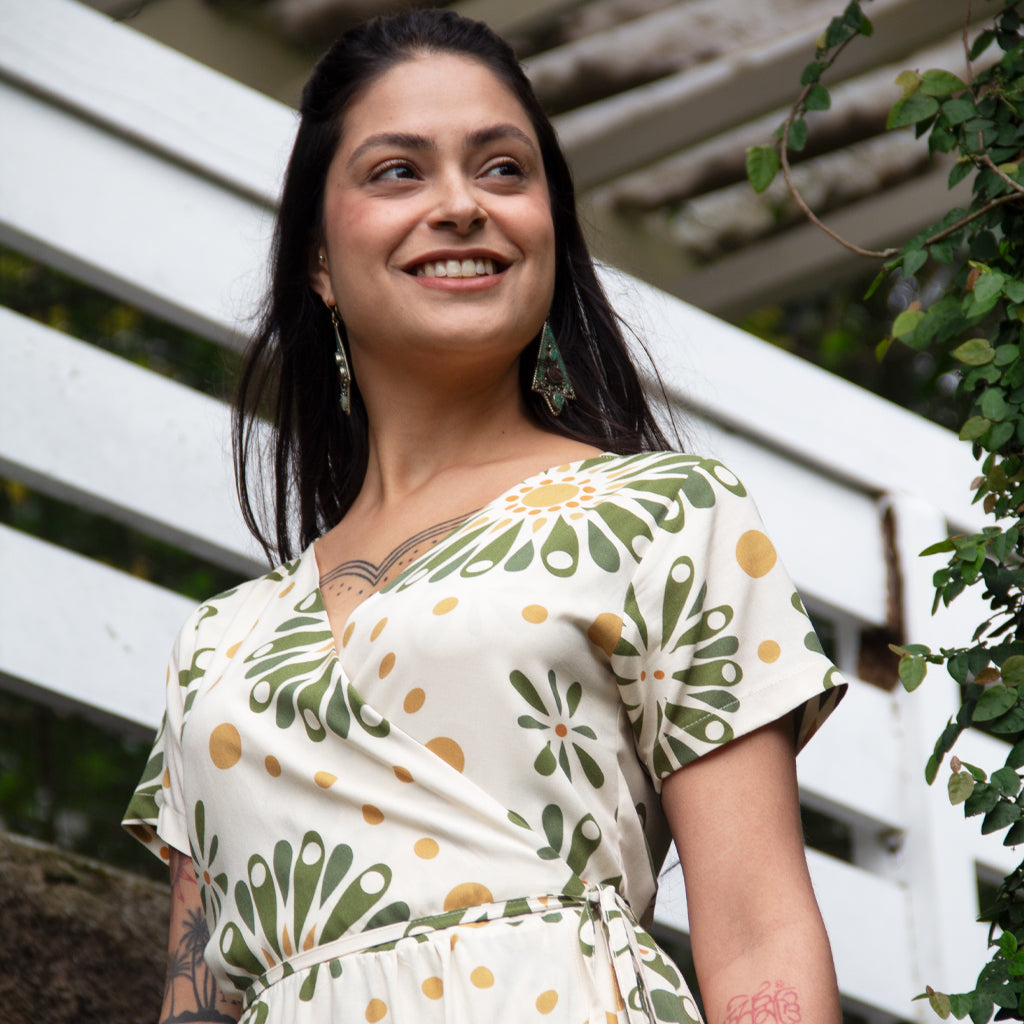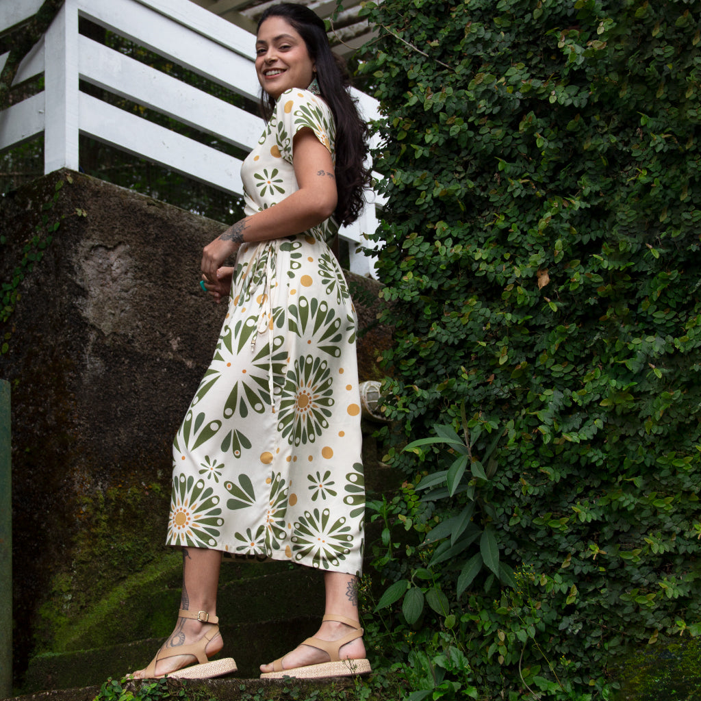 Vestido midi transpassado com mangas fluidas e busto duplo que garante segurança, conforto e liberdade. Usar sutiã? Só se quiser — ele foi criado para valorizar o corpo com naturalidade.